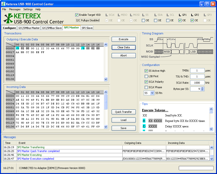 Most simple data operations can be performed using the built-in "Quick Read" or "Quick Write" commands. Both operations move a block of data to or from a slave device using the normal serial read or write protocols. However, the real power of the USB-910H adapter is found in its ability to execute scripts supporting any combination of bus transactions, delays, and I/O operations.